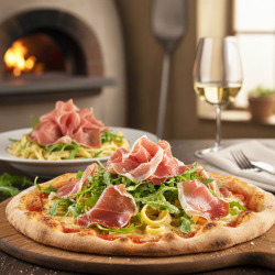 - ピザ:焼き上がったマルゲリータの上に、フレッシュなルッコラと一緒に山盛りに乗せて。