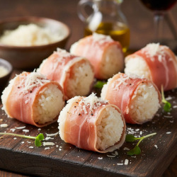- 作り方:ご飯にオリーブオイル、粉チーズ、黒胡椒を混ぜて小さめに握り、生ハムでくるりと巻きます。
