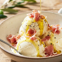 - 食べ方:バニラアイスに細かくちぎった生ハムを乗せ、良質なオリーブオイルと粗挽き黒胡椒をかけます。