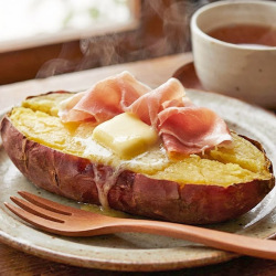 - 食べ方:温かい焼き芋をカットし、バターと生ハムを乗せるだけ。