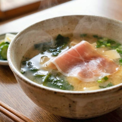 お味噌汁の仕上げに:お椀に盛ったあとに生ハムを1枚浮かべると、ベーコンのようなダシが出て、洋風の深みがあるお味噌汁になります。